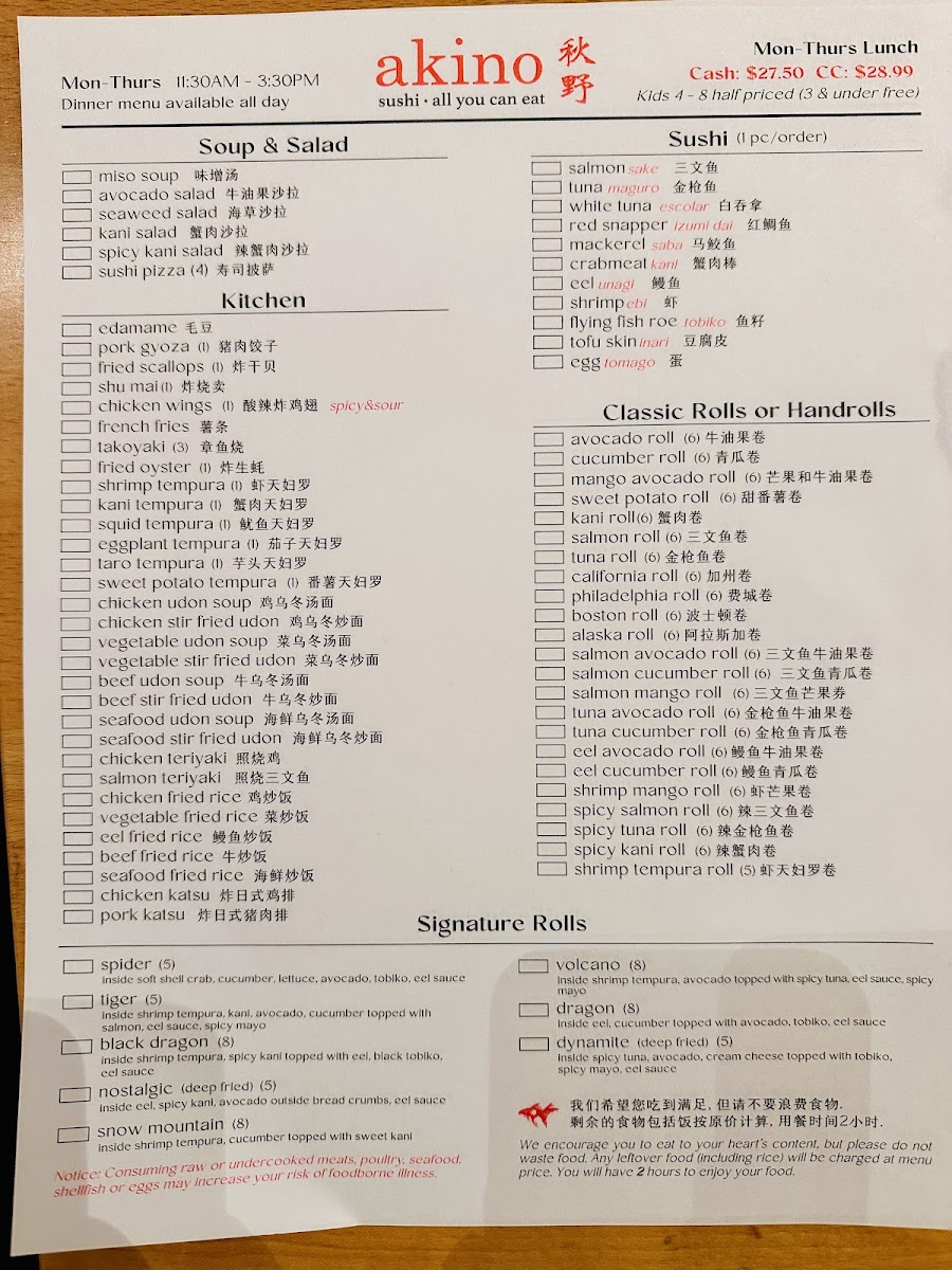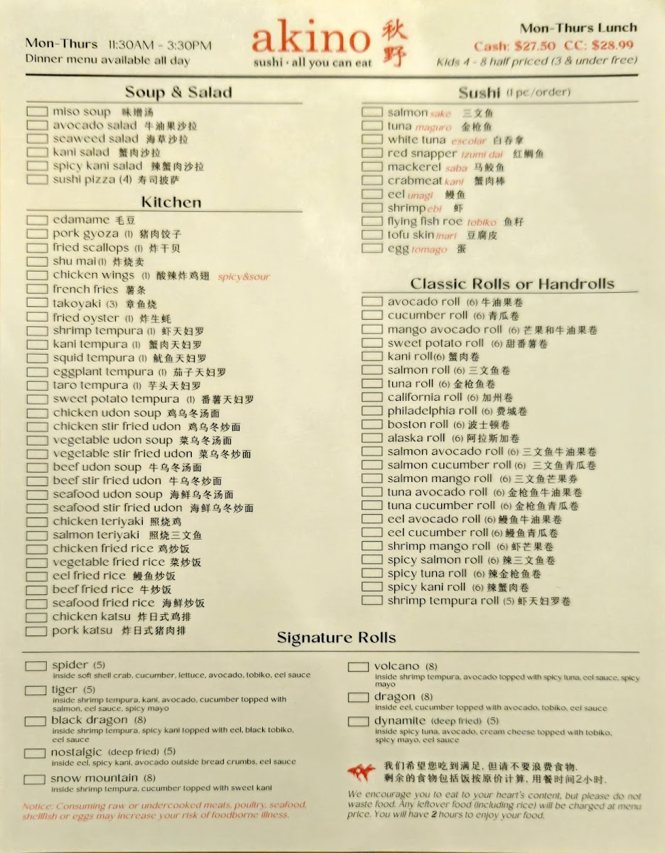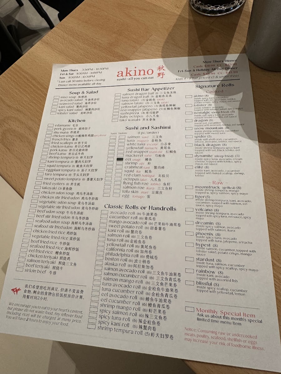 The menu at Akino offers a variety of Japanese and Asian dishes with a strong focus on sushi and traditional Japanese cuisine, suitable for lunch, casual dining, or takeout. It includes an all-you-can-eat (AYCE) option, which allows guests to sample a wide range of items within a set time frame.
