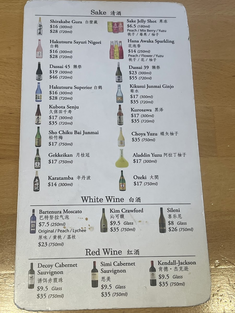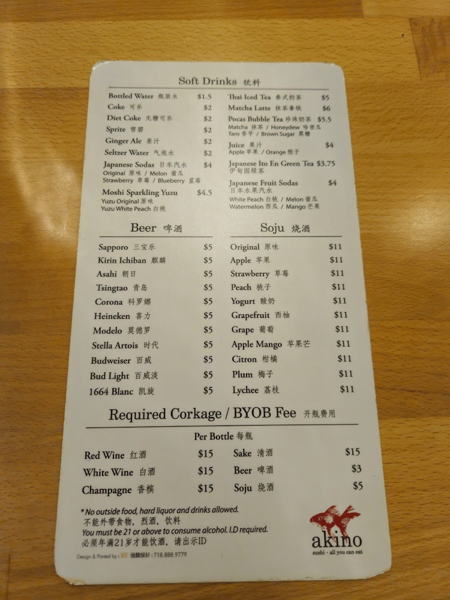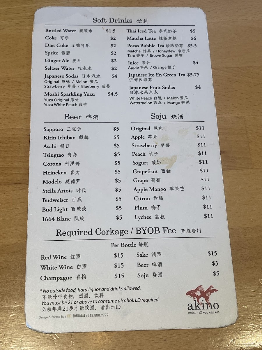 The menu at Akino offers a variety of Japanese and Asian dishes with a strong focus on sushi and traditional Japanese cuisine, suitable for lunch, casual dining, or takeout. It includes an all-you-can-eat (AYCE) option, which allows guests to sample a wide range of items within a set time frame.